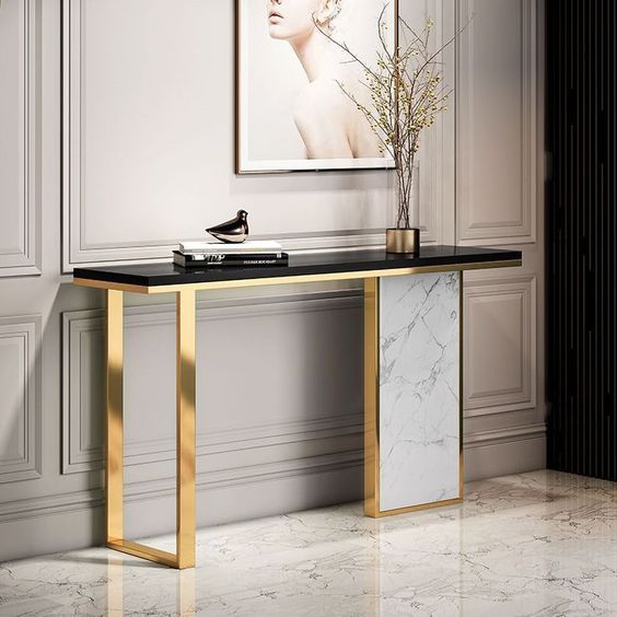 Console, Size: 160cm*40cm*90cm, Material: Stainless Steel / Steel, Coating: PVD coated / Electrostatic Powder Coating, Console Top: Tempered Glass / Marble, Console Buttom Leg Set complimented with Carrara Marble